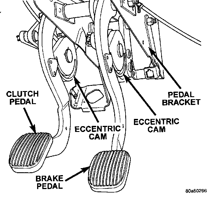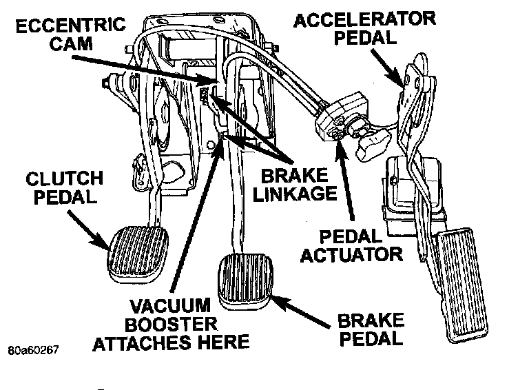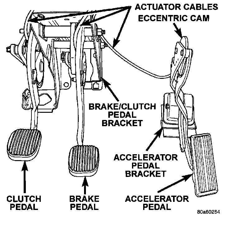Each pedal and its eccentric cam is connected through linkage to a second lever controlling that pedals vehicle function.