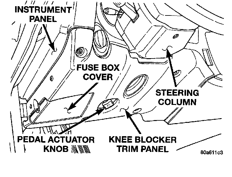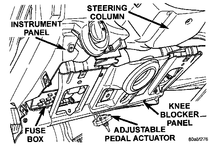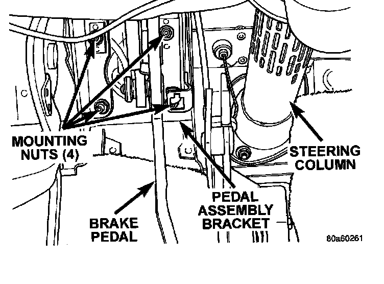 NOTE: The brake, clutch, and accelerator pedals used in this vehicle are adjustable. All three pedals can be adjusted back and forth to accommodate for the differences in drivers leg lengths, when the drivers seat is adjusted to its correct driving position. All three pedals of the adjustable pedal system are synchronized to adjust at the same amount using a common actuator mounted below the steering column.The components of the adjustable pedal system are not replaceable, if any pedal or component of the adjustable pedal system requires service the entire pedal system must be replaced. This requires that the entire pedal system (all three pedals) be removed from the vehicle when the replacement of any one pedal is required.