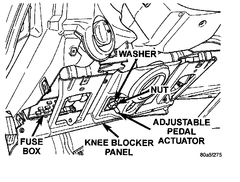 5. Remove the nut and washer, attaching the adjustable pedal actuator to the knee blocker panel. Remove the adjustable pedal actuator from the knee blocker panel.