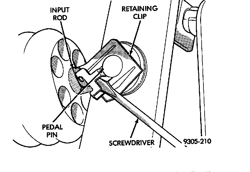 11. Remove the retaining clip from the brake pedal pin using following procedure. Position a small screwdriver between the center tang on the retaining clip and the brake pedal pin. Rotate blade of screwdriver enough so center tang on retaining clip can pass over end of brake pedal pin. Then pull retaining clip off brake pedal pin.