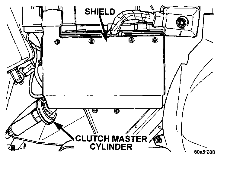 15. Remove the clutch master cylinder from dash panel. The clutch master cylinder is removed from the engine side of the dash panel by rotating it counter-clockwise until it disengages from the pedal assembly bracket on the inside of the vehicle. Move the clutch master out from the dash panel until it hits the left inner fender. This is required to avoid hitting and damaging the master cylinder when removing the pedal assembly.