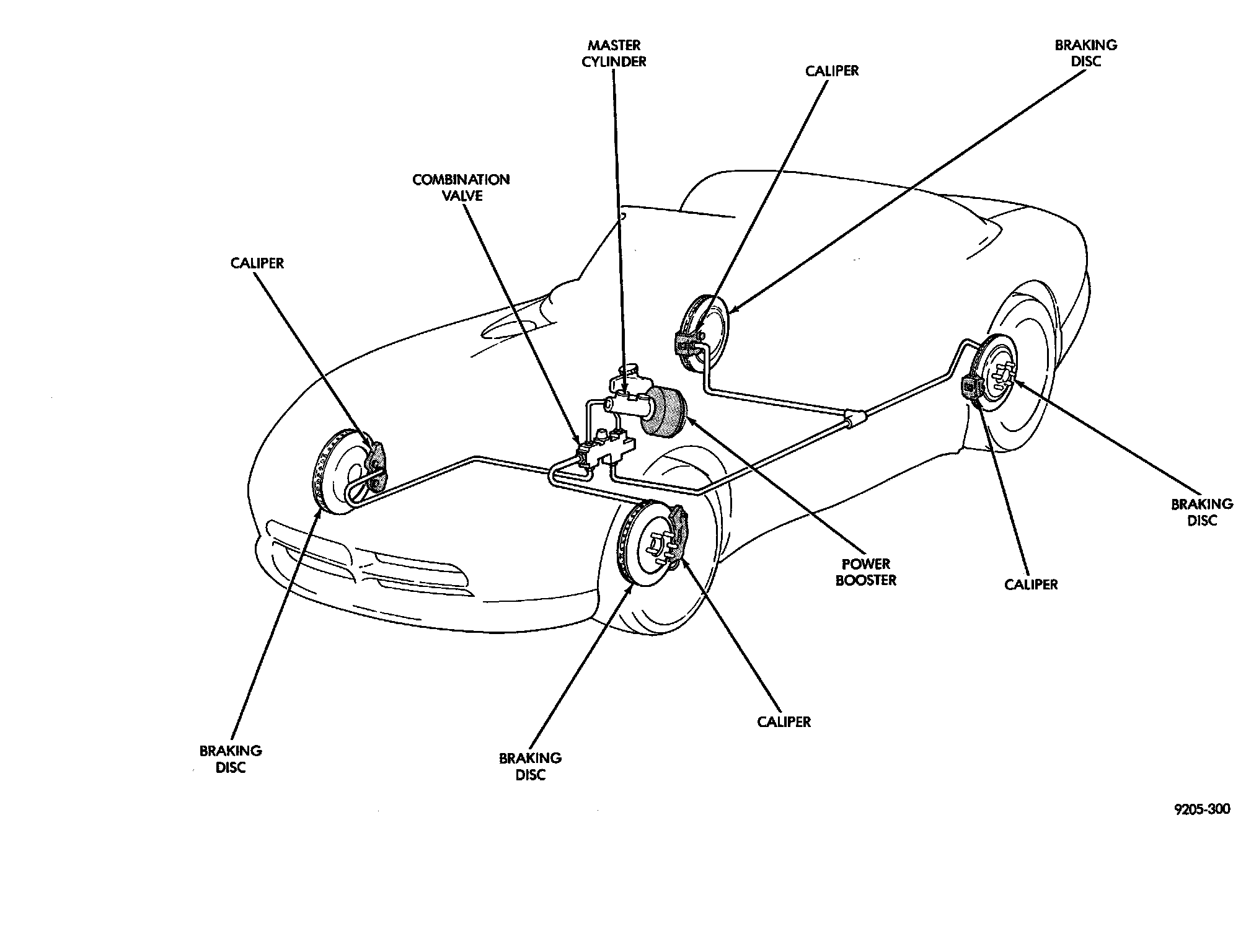 The hydraulically actuated four-wheel-disc brake system on the Viper consists of the components listed below. These components have been specifically developed for the Viper to meet the required braking performance standards of this vehicle.Below are the major brake components which are used on the Viper.