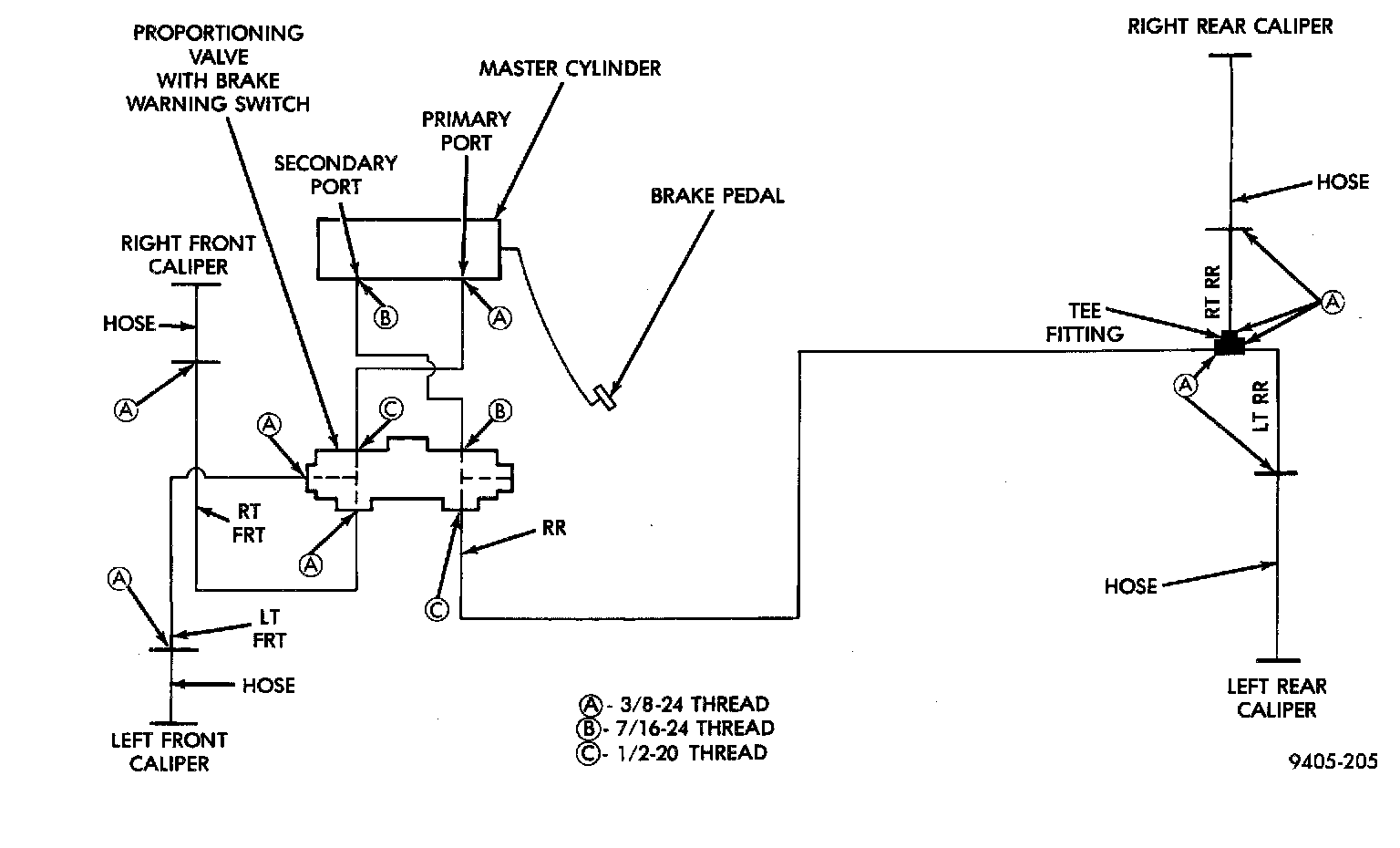 The hydraulic brake system on the Viper is a vertically-split type braking system. The Viper is hydraulically split front to rear, with both front brakes on one hydraulic circuit and both rear brakes on the other. This is unlike a conventional front wheel drive brake system which is diagonally split, having the left front and right rear brakes on one hydraulic circuit and the right front and left rear brakes on the other.