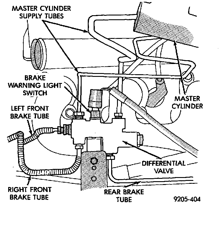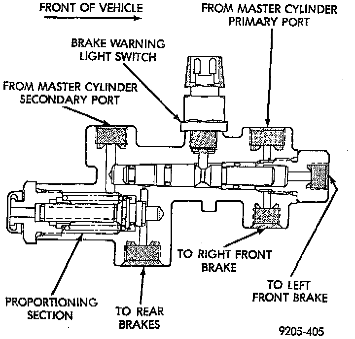 On light pedal applications equal brake pressure will be transmitted to the front and rear brakes. On heavier pedal applications the pressure transmitted to the rear will be lower than the front brakes. This will prevent premature rear wheel lock-up and skid. If hydraulic pressure is lost in one half of the front to rear split system, the operation of the remaining half of the brakes hydraulic system is not effected.