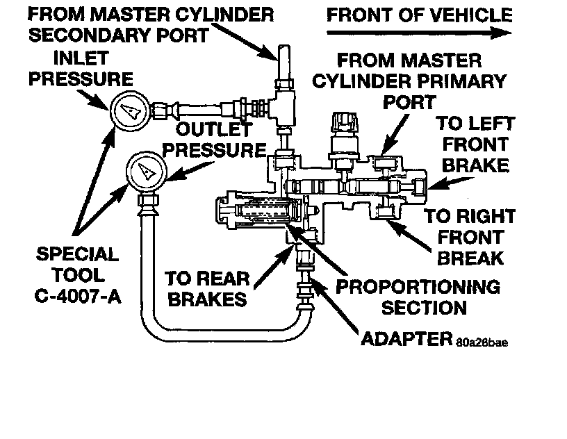 If premature rear wheel skid occurs on hard brake application, it could be an indication that a malfunction has occurred with the proportioning valve portion of the combination valve.To test the proportioning valve when the rear wheels of the vehicle slide first, leave the front brakes tubes connected to the combination valve, and proceed to test the proportioning valve for the rear brakes as follows: