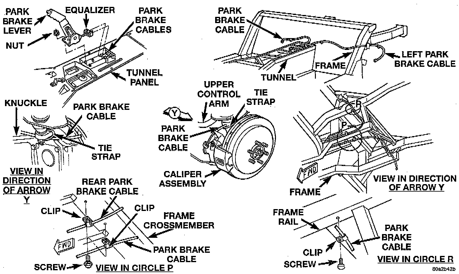 The Viper uses only 2 park brake cables. Each cable is attached to an equalizer at the park brake mechanism and to each rear disc brake caliper assembly.