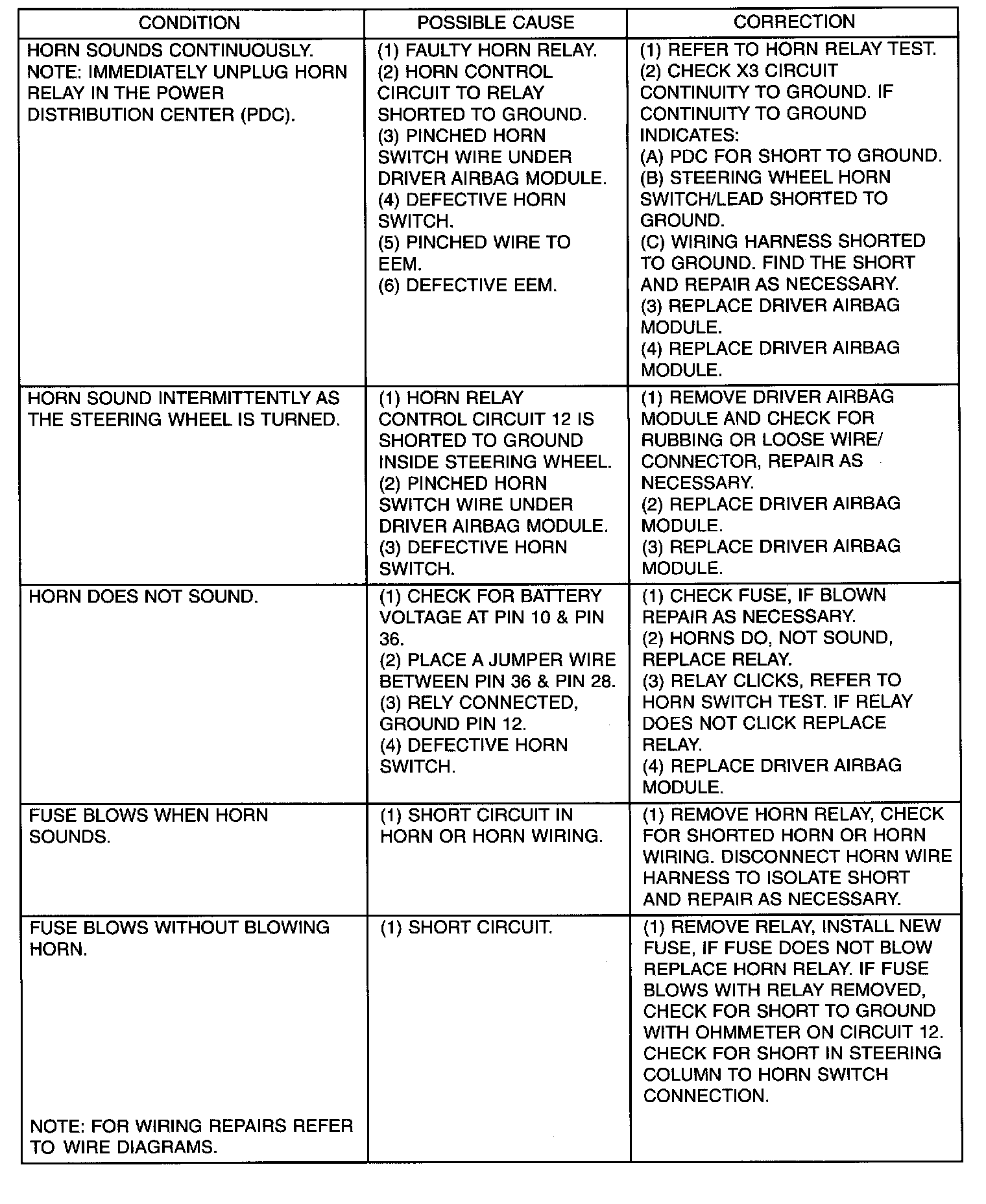 Refer to Horn System Test. If the horn does not sound, check horn fuse located in the Power Distribution Center (PDC). If the fuse is blown, replace with the correct fuse. If the horn fails to sound and the new fuse blows when depressing the horn switch, a short circuit in the horn or the horn wiring A between the fuse terminal and the horn is responsible, or a defective horn switch allowed the horn to burn out.