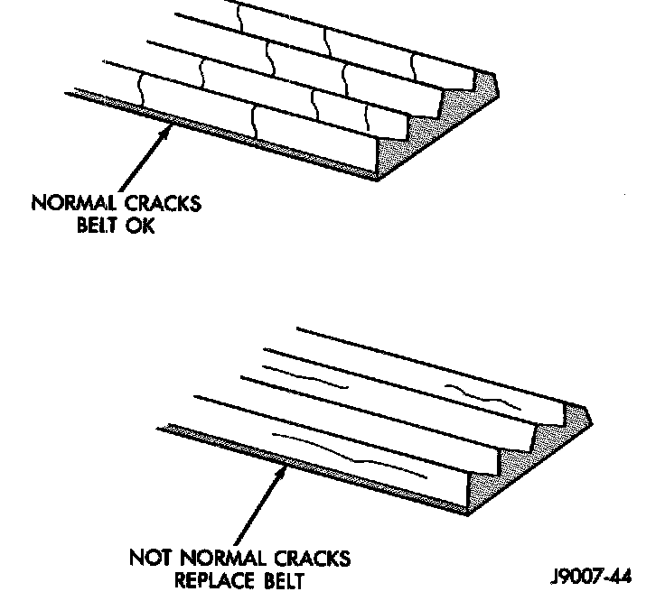 V-Ribbed belt system with back drive pulley may develop minor cracks across the ribbed side (due to reverse bending). These minor cracks are considered normal and acceptable. Parallel cracks are not.