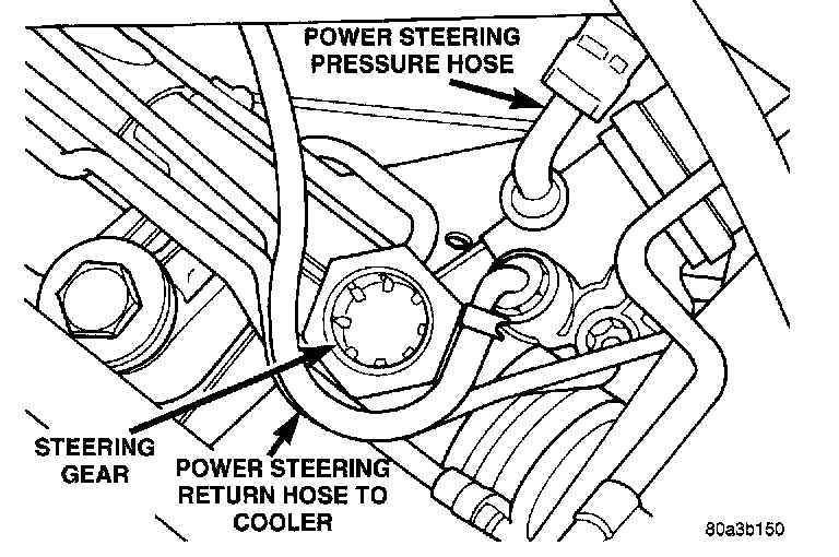 1. Remove the power steering fluid pressure hose from the steering gear. Allow the power steering fluid to drain from the hose.