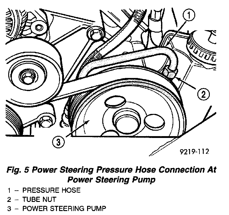 3. Remove the power steering fluid pressure hose from vehicle. The hose is removed out through the top between power steering pump and engine block.