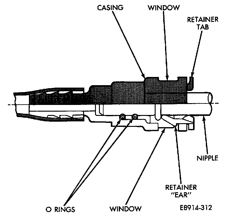 The quick-connect fitting consists of the O-rings, retainer and casing. When the fuel tube enters the fitting, the retainer locks the shoulder of the nipple in place and the O-rings seal the tube.