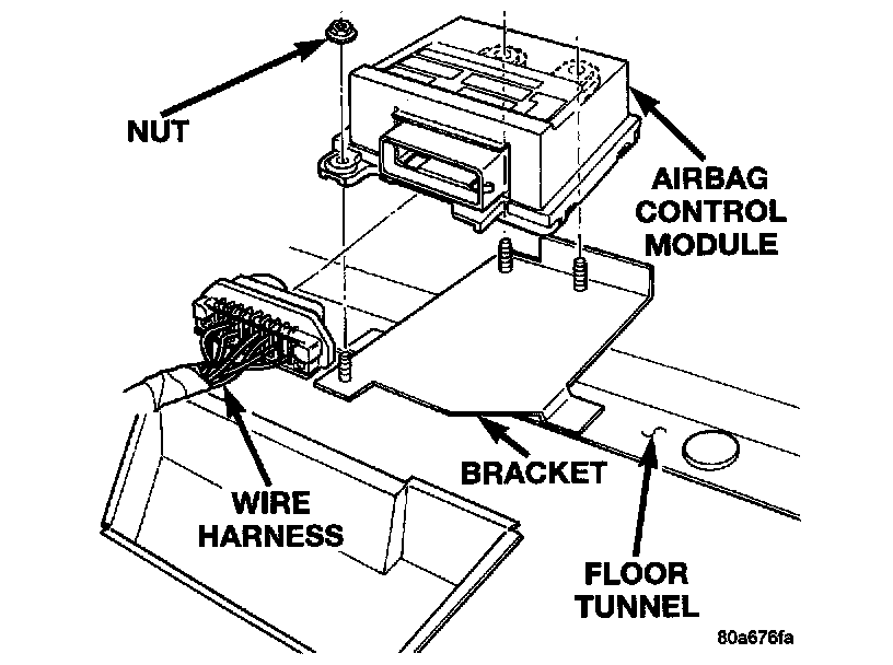 WARNING: THE AIRBAG CONTROL MODULE CONTAINS THE IMPACT SENSOR, WHICH ENABLES THE SYSTEM TO DEPLOY THE AIRBAG. TO AVOID ACCIDENTAL DEPLOYMENT, NEVER CONNECT THE AIRBAG CONTROL MODULE ELECTRICALLY TO THE SYSTEM UNLESS IT IS BOLTED TO THE VEHICLE. NEVER STRIKE OR KICK THE AIRBAG CONTROL MODULE. BEFORE BEGINNING ANY AIRBAG SYSTEM REMOVAL OR INSTALLATION PROCEDURES, DISCONNECT AND ISOLATE THE BATTERY NEGATIVE (GROUND) CABLE FROM THE VEHICLE BATTERY. THEN WAIT TWO MINUTES FOR THE SYSTEM CAPACITOR TO DISCHARGE BEFORE FURTHER SYSTEM SERVICE. THIS IS THE ONLY SURE WAY TO DISABLE THE AIRBAG SYSTEM. FAILURE TO DO THIS COULD RESULT IN ACCIDENTAL AIRBAG DEPLOYMENT, AND POSSIBLE PERSONAL INJURY.REMOVAL