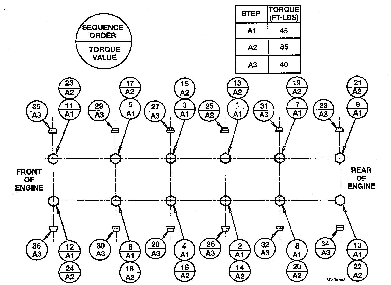 8. Step A3 Tighten the A3 Bolts to 54 Nm (40 ft. lbs.) in the sequence order shown in the illustration.