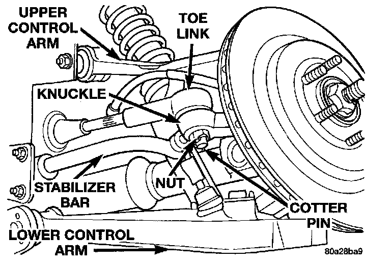 5. Install toe link outer tie rod end on knuckle. Install tie rod to steering knuckle attaching nut and tighten to a torque of 34 Nm (25 ft. lbs.). Install cotter pin.
