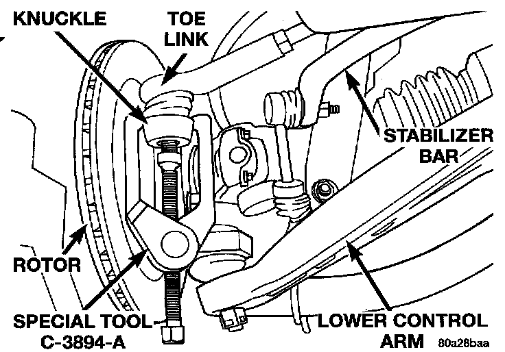 4. Remove the toe link outer tie rod from the knuckle using Puller, Special Tool C-3894A.