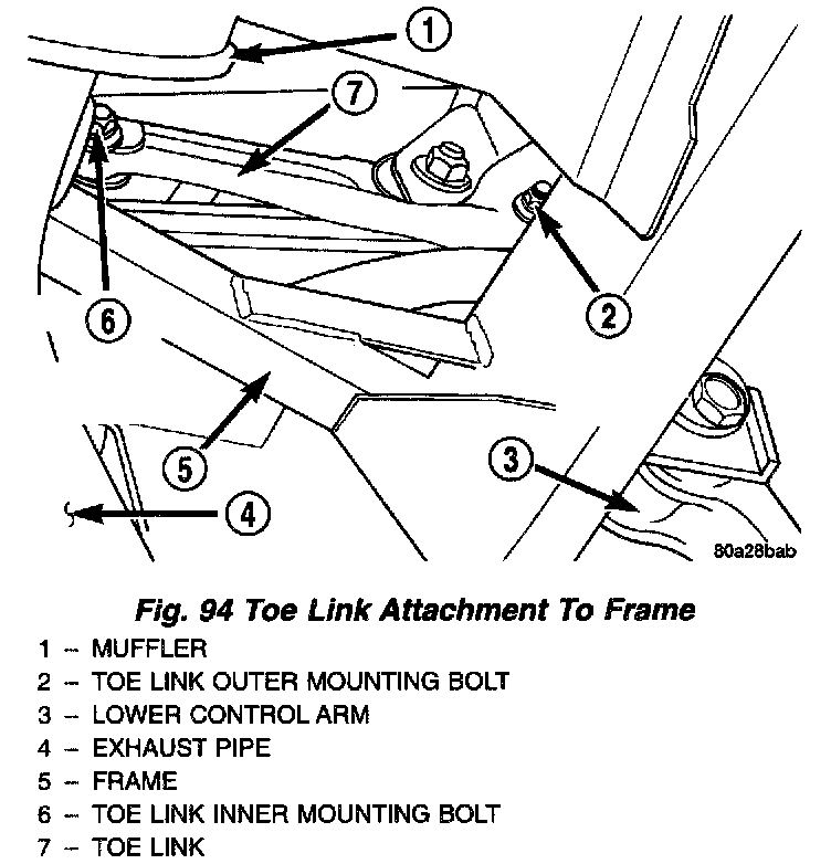 5. Remove the toe link to frame inner and outer attaching bolts and nuts.