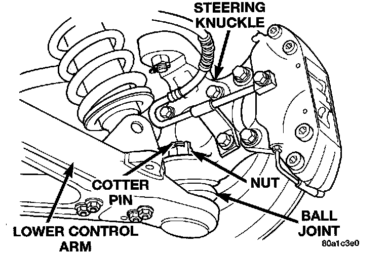 2. Install the lower ball joint stud into the steering knuckle. Install the ball joint to steering knuckle attaching nut. Tighten the attaching nut to a torque of 160 Nm (118 ft. lbs.). After tightening nut to specified torque, continue to tighten until cotter pin can be installed through nut and hole in ball joint stud, DO NOT LOOSEN NUT.