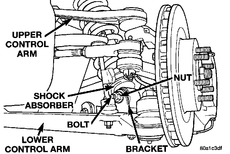 4. Install the shock absorber into the mounting bracket on the lower control arm. Install the shock absorber to mounting bracket bolt and nut. BUT DO NOT TIGHTEN AT THIS TIME.