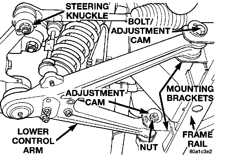 20. After the vehicle's front and rear suspension is aligned to required specifications, tighten lower control arm cam bolts and nuts to their to their specified torque.