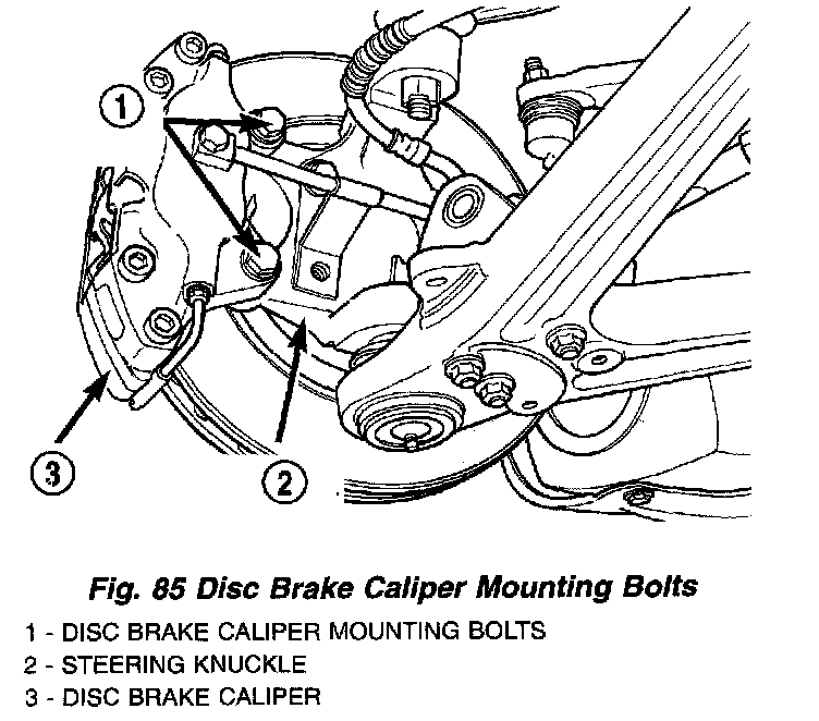 8. Install the brake caliper attaching bolts and tighten to a torque of 115 Nm (85 ft. lbs.).