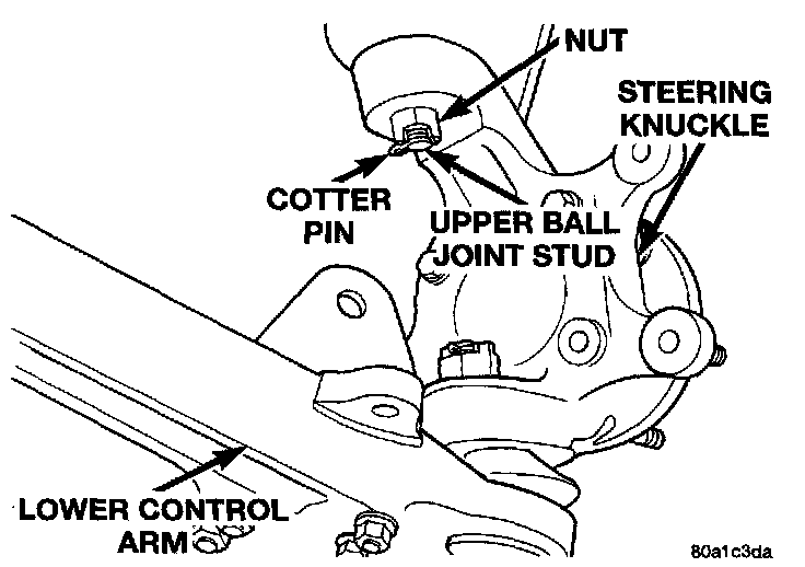 2. Install the upper ball joint stud into the steering knuckle. Install the upper ball joint stud, to steering knuckle attaching nut. Torque ball joint stud to steering knuckle nut to 102 Nm (75 ft. lbs.). Install the upper ball joint attaching nut cotter pin. Align the cotter pin hole in the attaching nut and ball joint stud only by tightening the attaching nut (DO NOT LOOSEN IT).