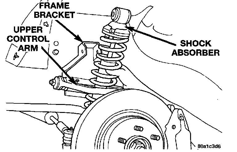 8. Using a pry bar, carefully push down on the upper control arm far enough to install the top of the shock absorber in the frame bracket.