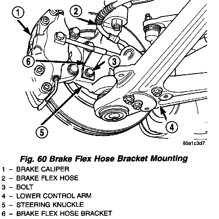 5. Align brake hose bracket with hole in steering knuckle. Install the hub/bearing assembly attaching bolt. Tighten the hub/bearing attaching bolt to a torque of 61 Nm (45 ft. lbs.).