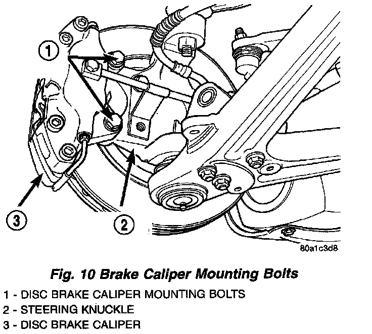 4. Install disc brake caliper on steering knuckle. Align caliper mounting holes with threaded holes in steering knuckle. Install the 2 bolts attaching the caliper to the steering knuckle. Tighten both mounting bolts to a torque of 115 Nm (85 ft. lbs.).