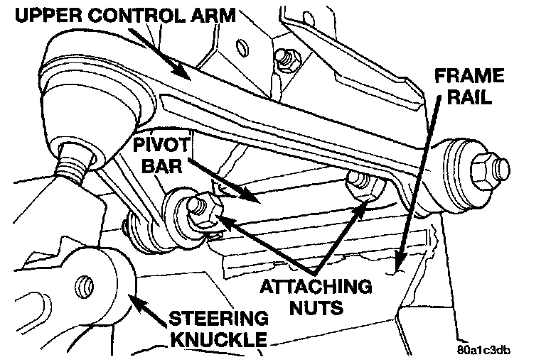 NOTE: When installing the upper control arm be sure the sport shims are in place between the pivot bar and the frame rail. One sport shim is to be installed on each pivot bar mounting stud.CAUTION: When installing the upper control arm, the serrated area around the mounting stud holes in the pivot bar must be facing the frame.
