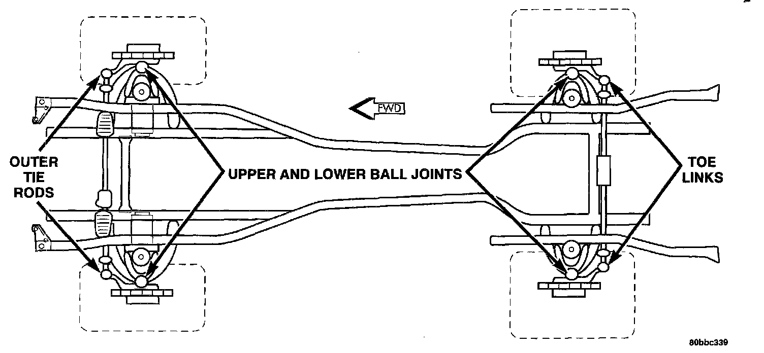The serviceable lubrication points on the suspension and its components are indicated in the figure. Following the vehicle's maintenance schedule, lubricate each point until a slight swelling is noticed in the seal boot. Do not overfill the seal boots.