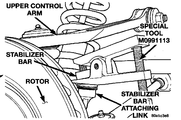 CAUTION: Use only Puller, Special Tool MB991113, to remove the attaching link from the stabilizer bar. Use of a pickle fork or other alternate tool will damage the seal and ball joints on attaching link.