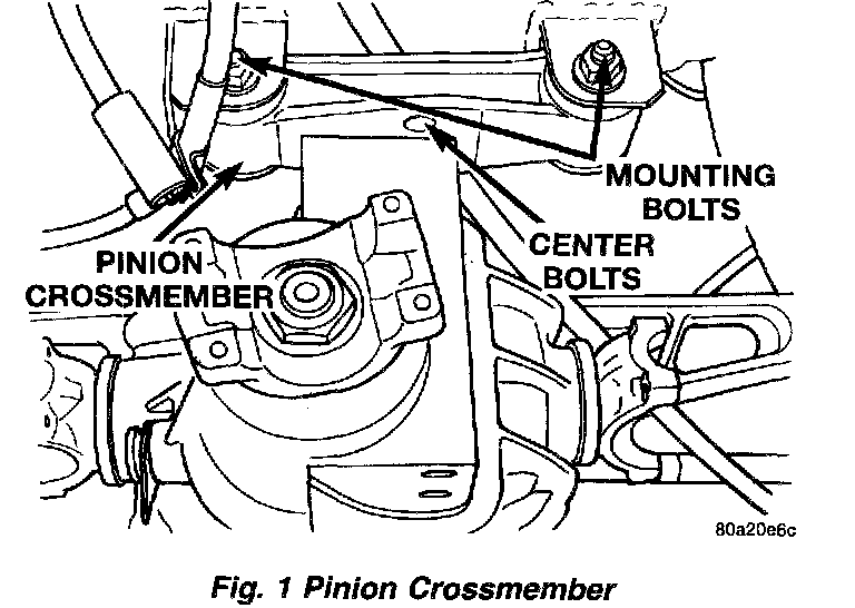1. Remove the two bolts at the center of the pinion crossmember attached to the differential housing.