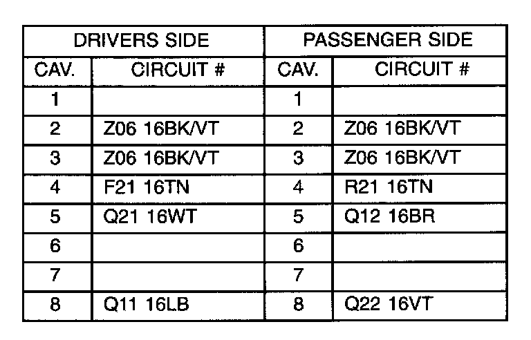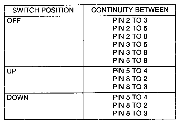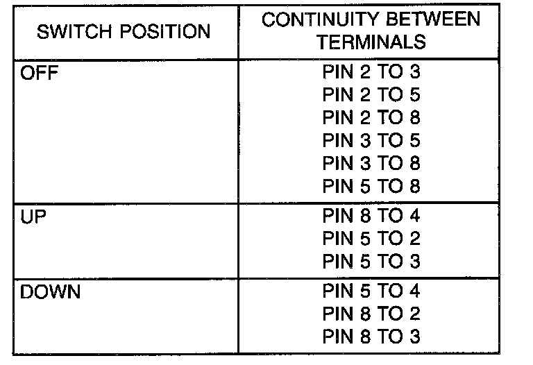 Remove the switch from its mounting, refer to the Window Switch Removal and Installation procedures. Using an ohmmeter, refer to the Drivers and Passenger Side Window Switch Continuity Test tables to determine if continuity is correct. If the results are not obtained, replace the switch.
