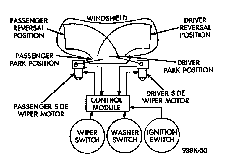 For the module to control the operation of two motors, it must sense the position of the wiper blades. The position is sensed by two switches built into each wiper motor that indicate when the motor is in the reversal, or park positions. After determining the switch positions, the module uses a motor speed signal to synchronize the wiper operation.