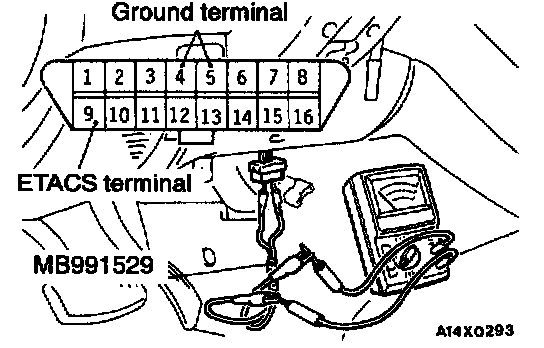 1. Use the special tool to connect a voltmeter between the ground terminal and the ETACS terminal of data link connector.