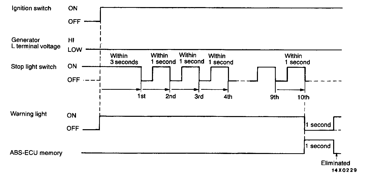 When the ignition switch is turned on while the stop light switch is on, the brake pedal will operate 10 times in succession according to the timing given below.