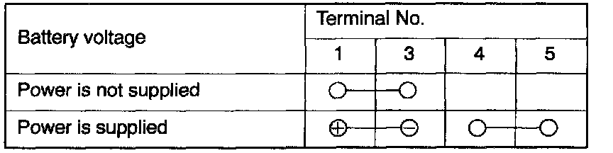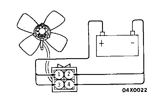 (1) Check to be sure that the radiator fan rotates when battery voltage is applied between terminals (as shown in the figure).