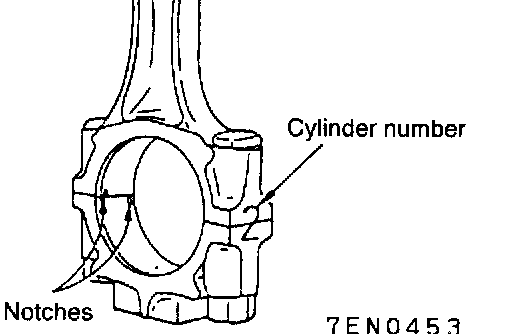 (1) Mate the correct bearing cap with the correct connecting rod by checking with the alignment marks marked during disassembly. If a new connecting rod which has no alignment mark is used, position the notches for locking the bearing on the same side.