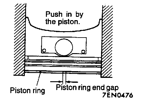 (2) Insert a piston ring into the cylinder bore. Force it down with a piston, its crown being in contact with the ring, to correctly position it at right angle to the cylinder wall. Then, measure the end gap with a feeler gauge. If the end gap is excessive, replace the piston ring.