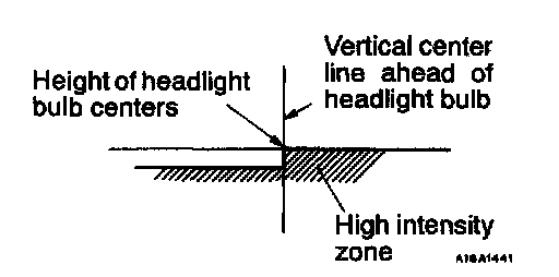 1. A properly aimed lower beam will appear on the aiming screen 3 m (9.8 feet) in front of the vehicle. The shaded area as shown in the illustration indicates high intensity zone.