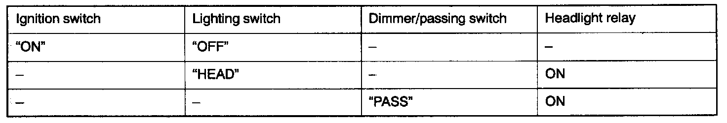 - When the dimmer/passing switch is set to the "ON" position, the headlight relay is switched ON and the high beam of the headlight illuminates