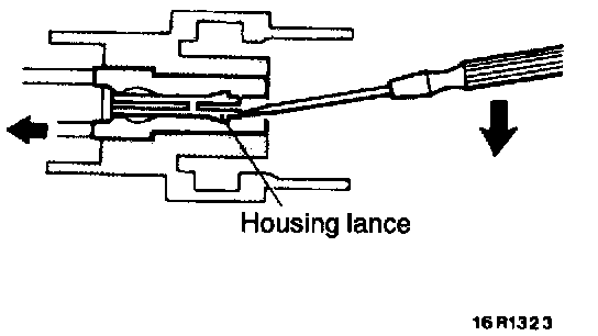 2. Insert the tip of the screwdriver [1.4 mm (0.06 in.) or 2.0 mm (0.08 in.) width] into the connector as shown in the figure, raise the housing lance slightly with the tip, and pull out the terminal.
