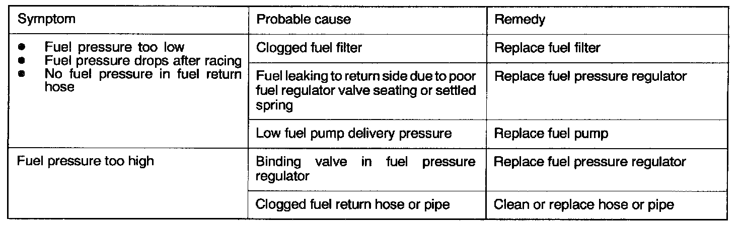 10. If any of the fuel pressure measured in steps 8 to 9 is out of specification, troubleshoot and repair according to the table.