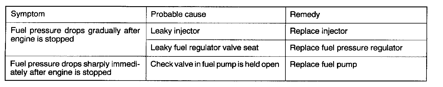 11. Stop the engine and observe fuel pressure gauge reading. Normal if the reading does not drop within 2 minutes. If it does, observe the rate of drop. Troubleshoot and repair according to the table.