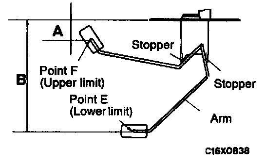 1. Move the float and measure height A at point F (highest) and B at point E (lowest) with float arm touching stopper.