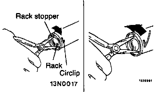 CAUTION: Insert circlip to rack stopper hole while turning rack stopper clockwise.