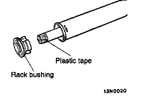 Wrap the rack end with plastic tape, apply a coating of the specified fluid, and then install the rack bushing and rack stopper.