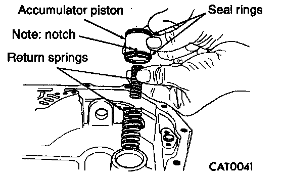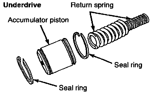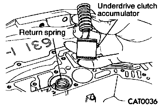 7. Remove underdrive clutch accumulator and overdrive clutch accumulator with return springs and seal rings.