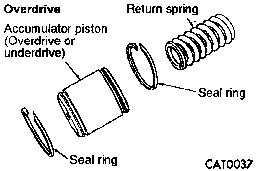 8. Remove return spring (overdrive) or two return spring (underdrive) and two seal rings from the overdrive and underdrive clutch accumulator pistons.