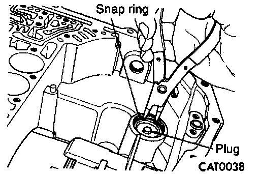 9. Remove the snap ring holding the low/reverse accumulator plug (cover) in place.